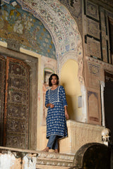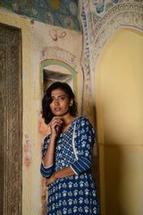 This set features a classic blue cotton mulmul kurta with embroidery detailing on the neckline.