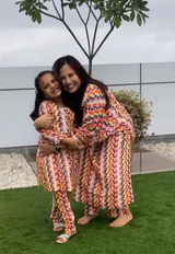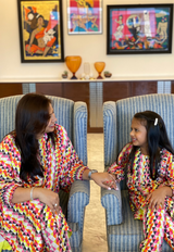 A relaxed matching cotton silk set in geometric print inspired by Indian festivities. Tunic with front open and gathers.