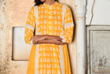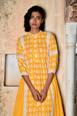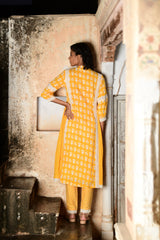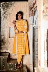 This set features a freesia yellow cotton mulmul kurta with gentle gathers on the sides.