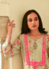 Kurta & Pants – Mint Green with Blush & Coral Floral Accents.