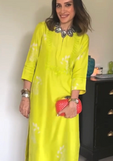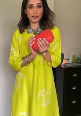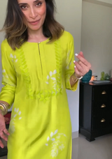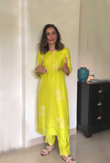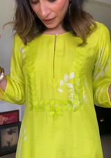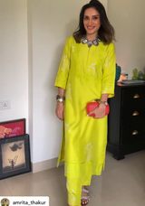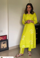 As seen on Celebrity influencer “Amrita Thakur” this set features our handcrafted lime green Cotton silk kurta, with appliqué work on the yoke and back. Paired with Chanderi pants.
