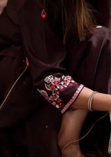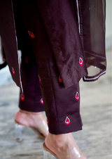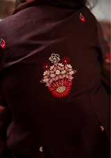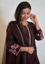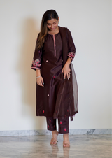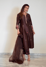 An Umber brown Chanderi Silk kurta set win an open front and intricate thread hand embroidery on the overall kurta in varied shades.