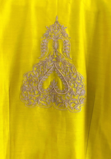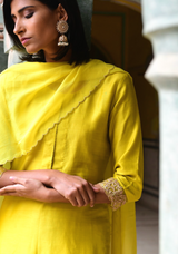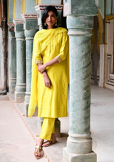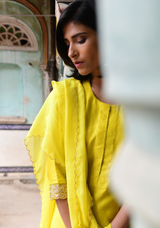 Featuring our vivid yellow Kurta set with intricate detailing on the neck, sleeves and back paired with a scalloped dupatta.
