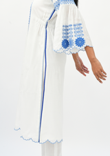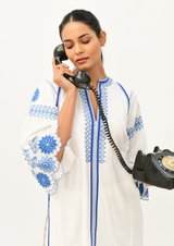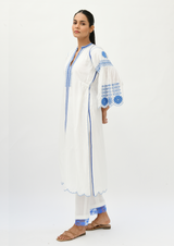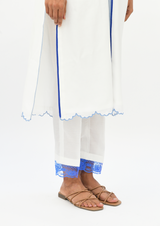 A cotton silk kurta sways comfort with a straight relaxed fit, while the intricate floral embroidery lends grace to the outfit. The sleeves and the bottom of the kurta feature scalloped detailing.