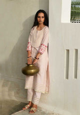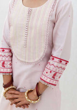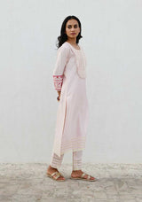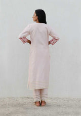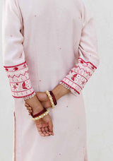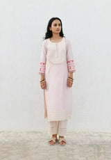 A pastel pink kurta tailored in a straight silhouette, hand-embroidered thread work on the sleeve, yoke with crochet and pin tucked detailing.