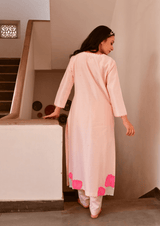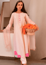 Paired with a comfortable pants and embroidered dupatta, this charming set in the daintiest of hues and beguiling applique hand embroidery is apt for all happy celebrations.