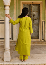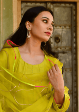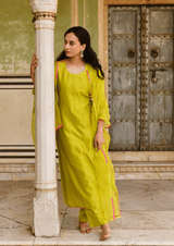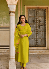 Paired with a comfortable pants and a fully embroidered dupatta. This beautiful set in green hue and hand embroidery make it a perfect lightweight option for festive occasions.