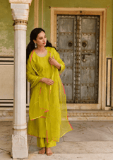 Step into traditional embrace with our Parna Set. This ensemble features the finest Chanderi silk fabric, known for its soft, airy texture and luxurious feel.