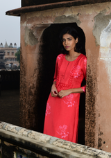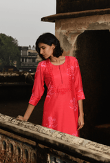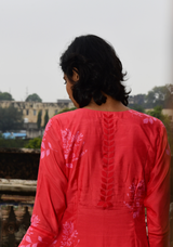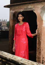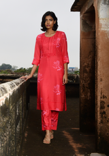 Our handcrafted “Flame Scarlett” Red kurta, with appliqué work on the front and back paired with pants — an understated version of this beautiful bright Colour.