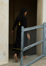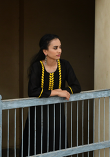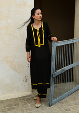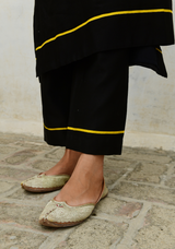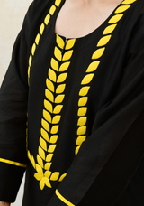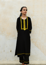 Featuring our midnight black chanderi set in a straight silhouette. With appliqué work on the yoke in yellow that reflects neutrality and simplicity. Paired with Chanderi pants.