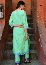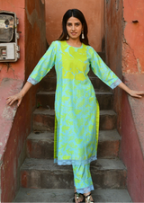 The Basant set, is crafted in a contemporary floral print. It is finished with appliqué detailing on the neck.