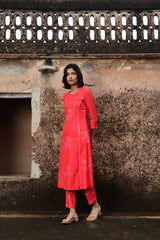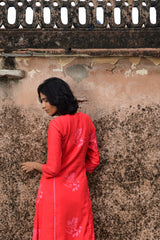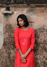 Our handcrafted Cotton Silk Persian Red kurta paired with pants — an understated version of this beautiful bright Color.