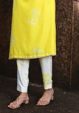 The set features our Gulmohar print, lace and hand embroidery on the kurta, paired with pearl ivory pants. Simple yet classic is the statement promoted through this kurta set.