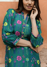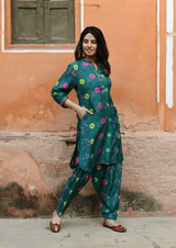 Step into floral embrace with our Green Printed Kurta Set. This ensemble features the finest cotton silk fabric, known for its soft, airy texture and luxurious feel.
