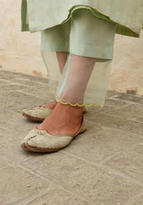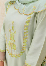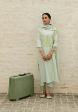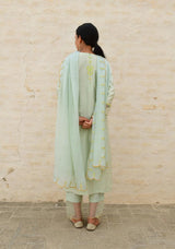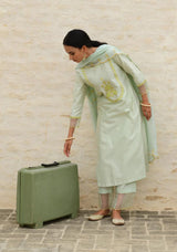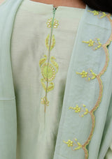 A mint green embroidered chanderi kurta with embroidered chiffon dupatta and scalloped pants.